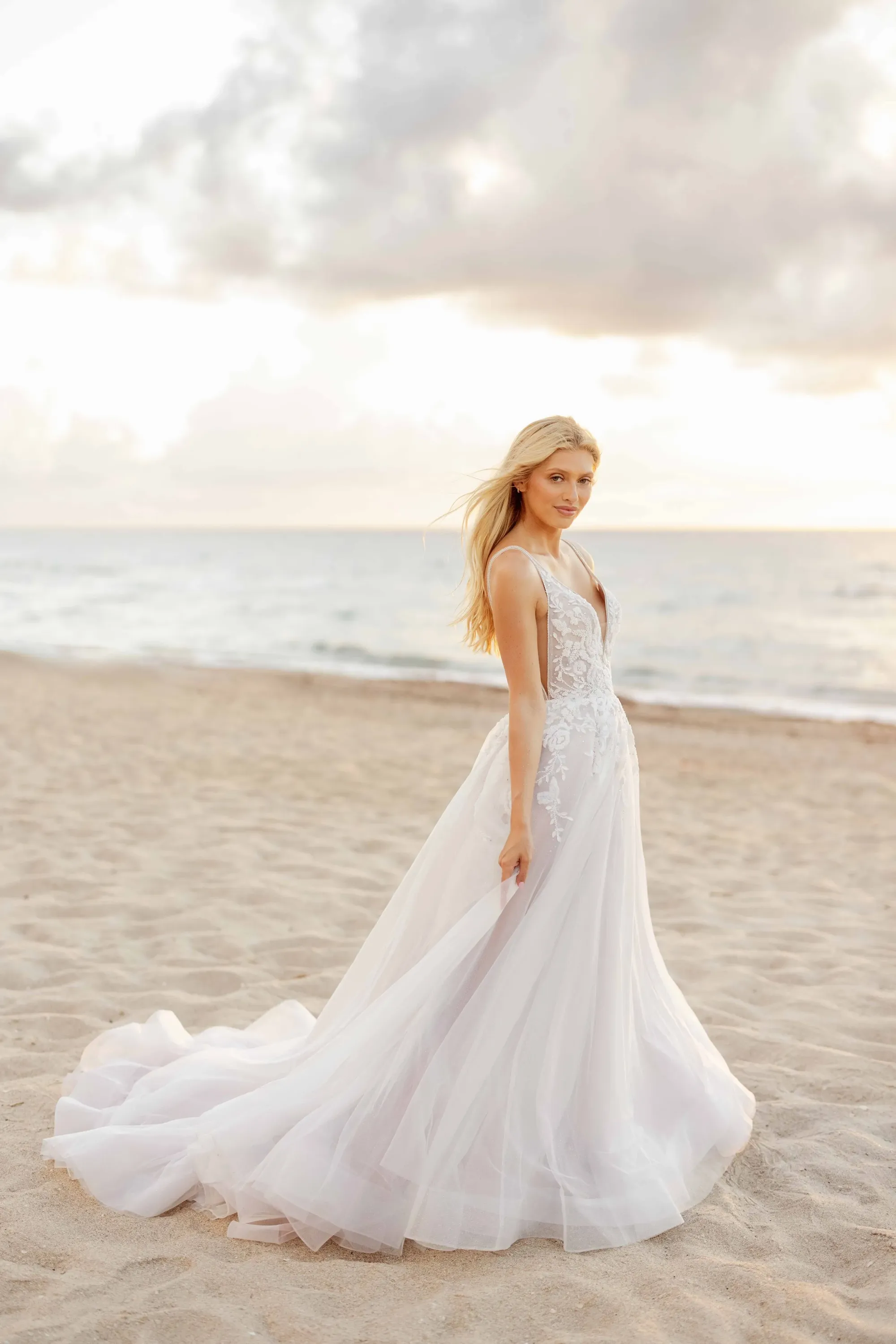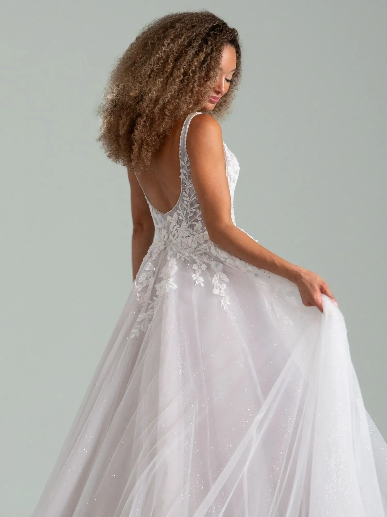 Ethereal, magical, and full of movement, “Wingardium” by Hayley Paige feels like a spell brought to life. Dimensional floral embroidery floats across orchideous tulle, while a plunging rhinestone-trimmed neckline adds subtle sparkle. With airy volume and dégradé shading, this gown is perfect for the bride who loves enchantment paired with modern, sculpted elegance.