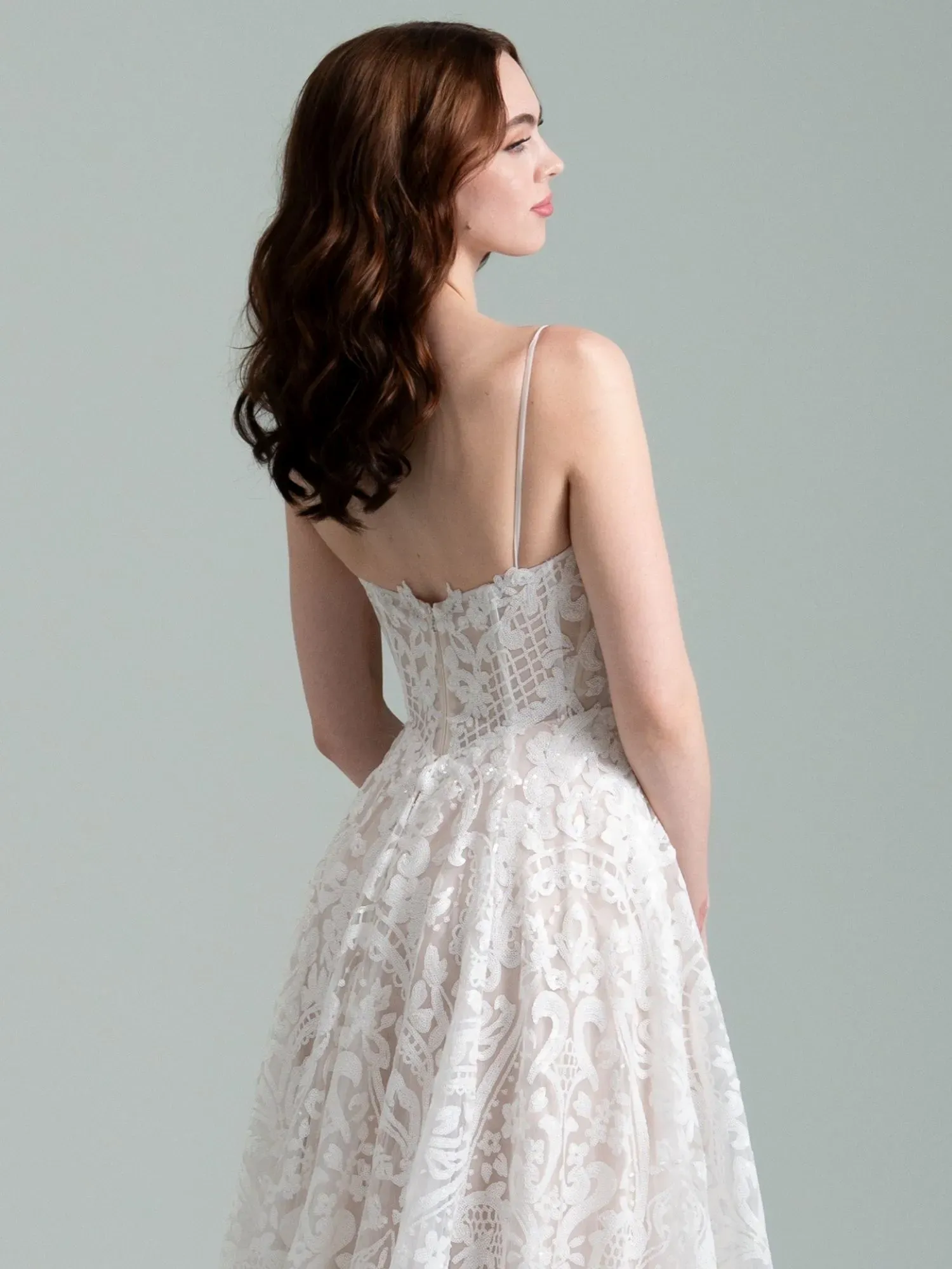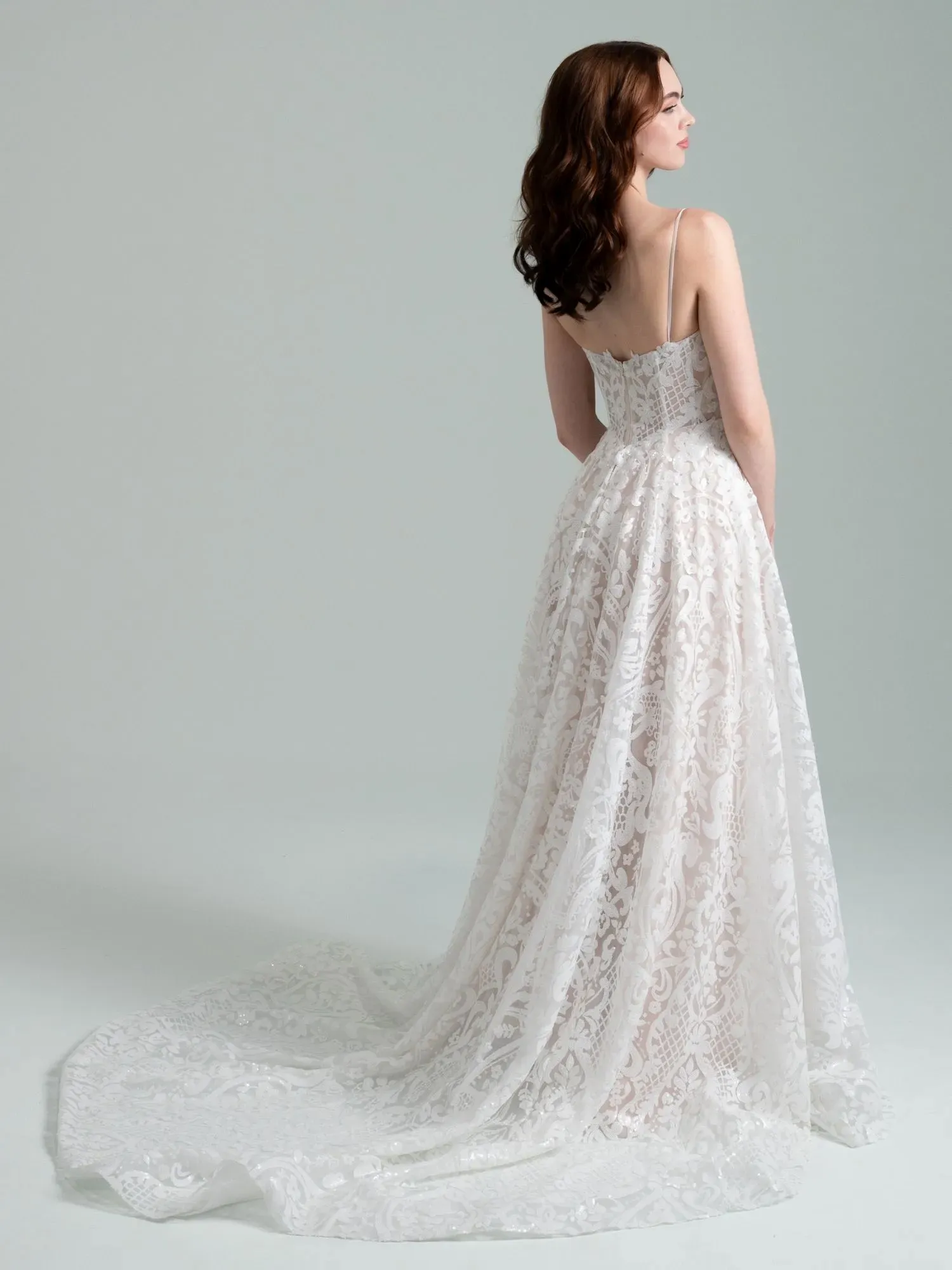 Ethereal, sparkling, and endlessly romantic, “When I Was the Sky” by Hayley Paige layers sentiment and luminosity in an A-line silhouette. Marrakesh beadwork shimmers across the gown, while a delicate bodice and criss-cross back add movement and quiet sensuality—perfect for the bride who loves intricate detail and a sense of expansive, airy elegance.