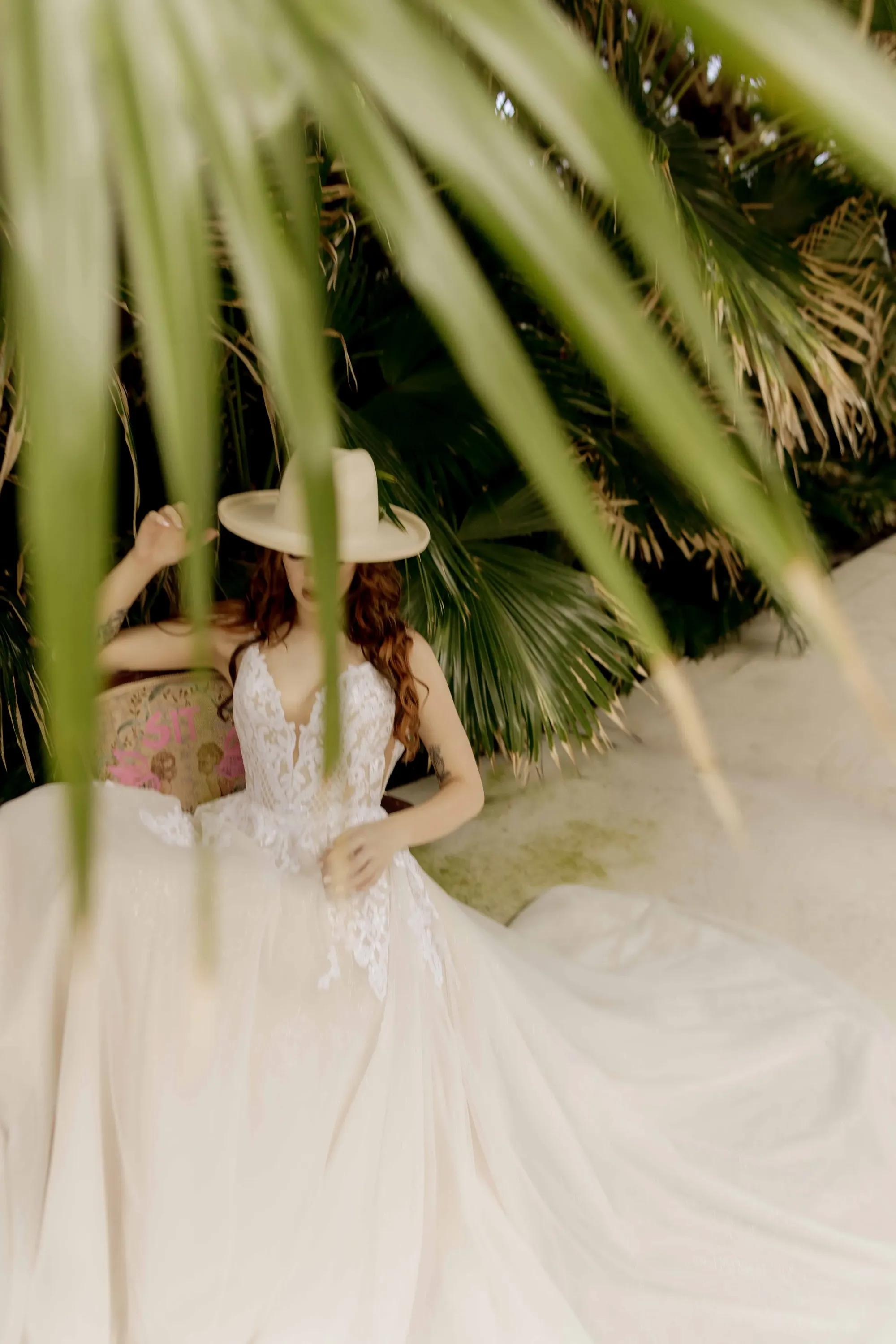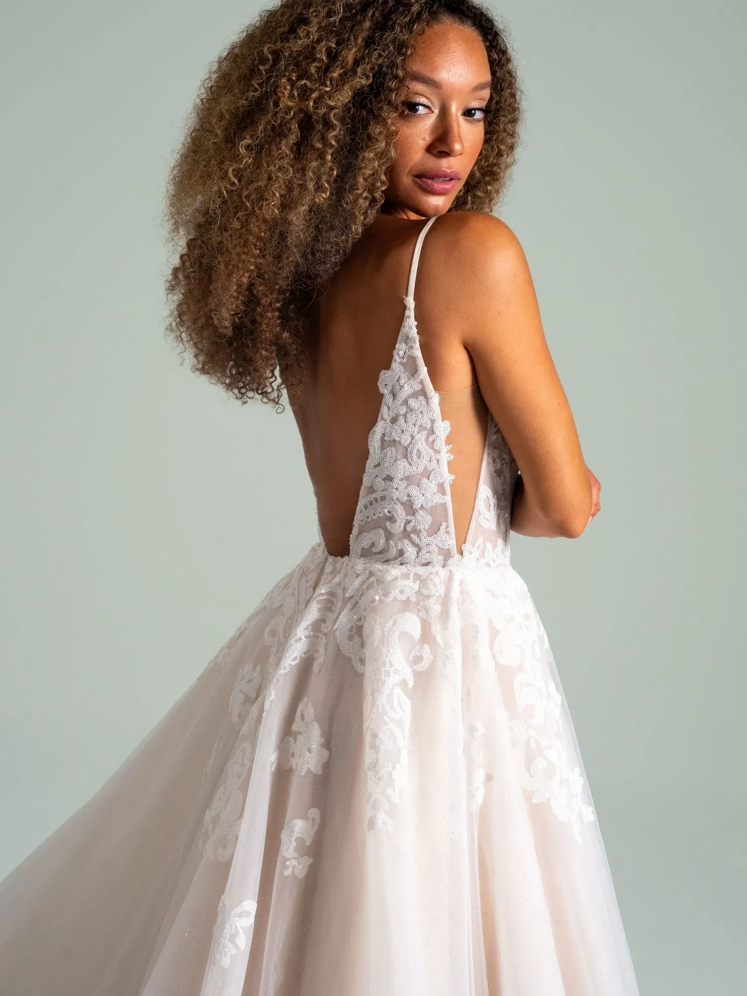 Radiant, romantic, and effortlessly elegant, “Eros Rising” by Hayley Paige is an A-line gown that balances bold confidence with soft femininity. Perfect for the bride who loves luminous beadwork, flowing movement, and a modern, eye-catching silhouette.