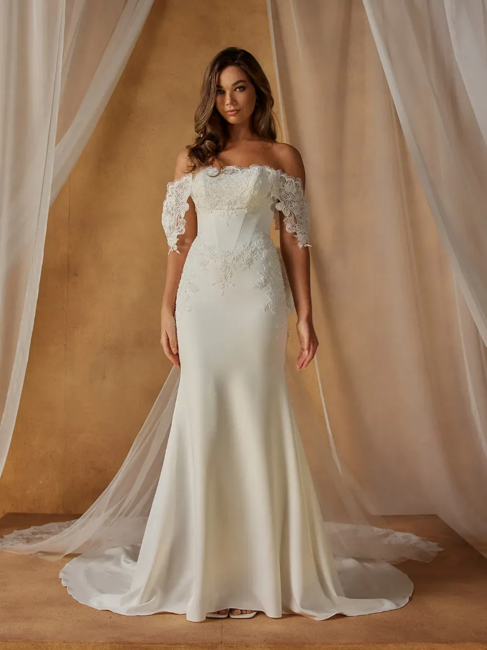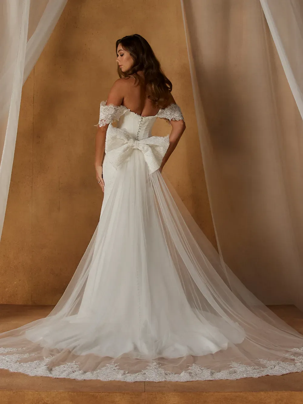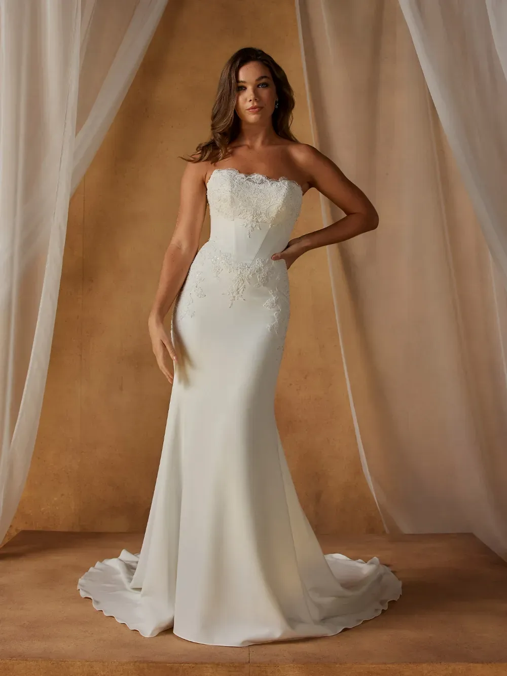 Timeless with a contemporary edge, Natine by Madi Lane Bridal pairs classic lace artistry with clean crepe tailoring. Thoughtful details and soft structure create understated sophistication.