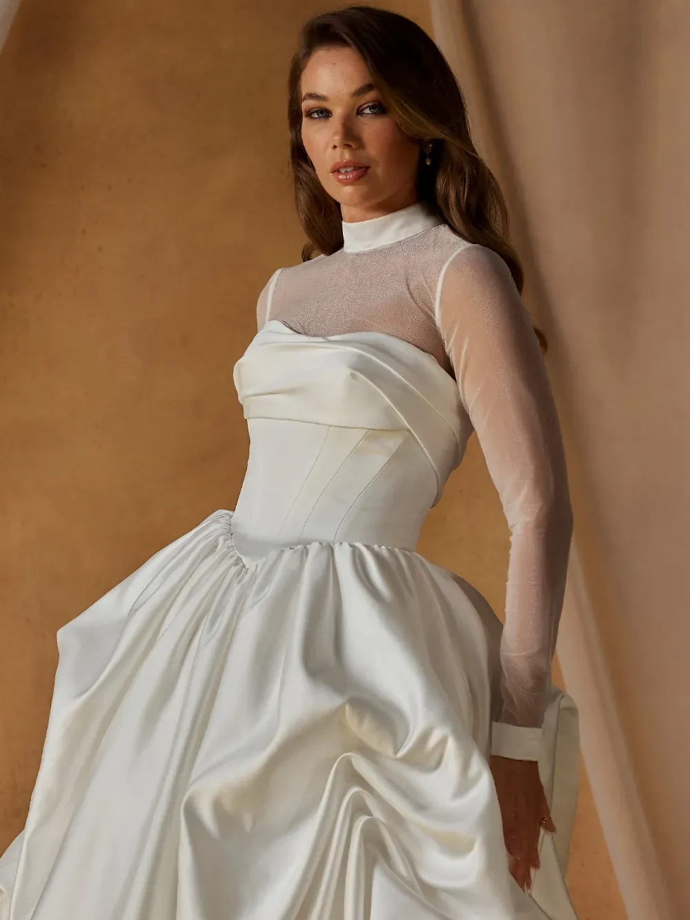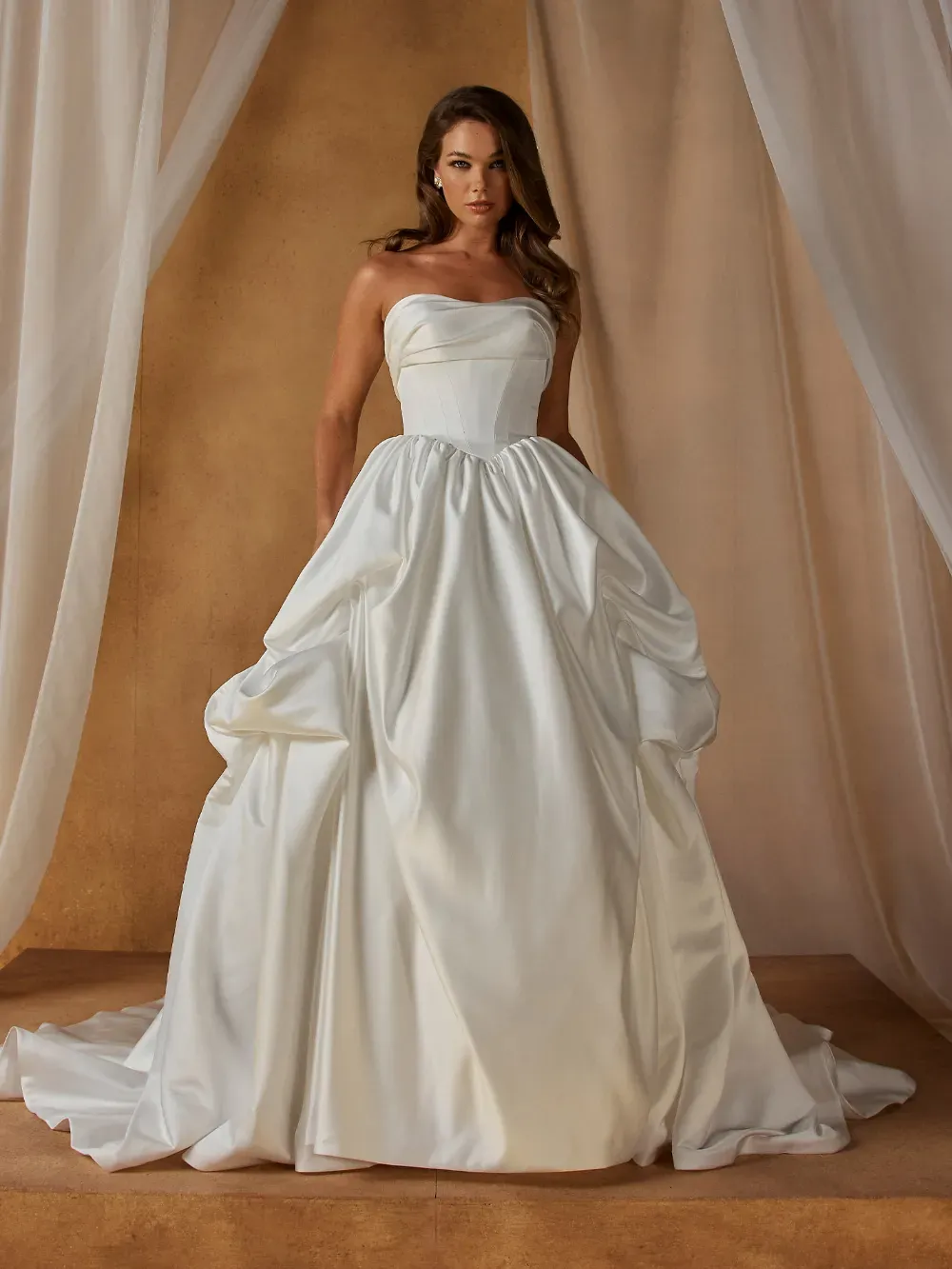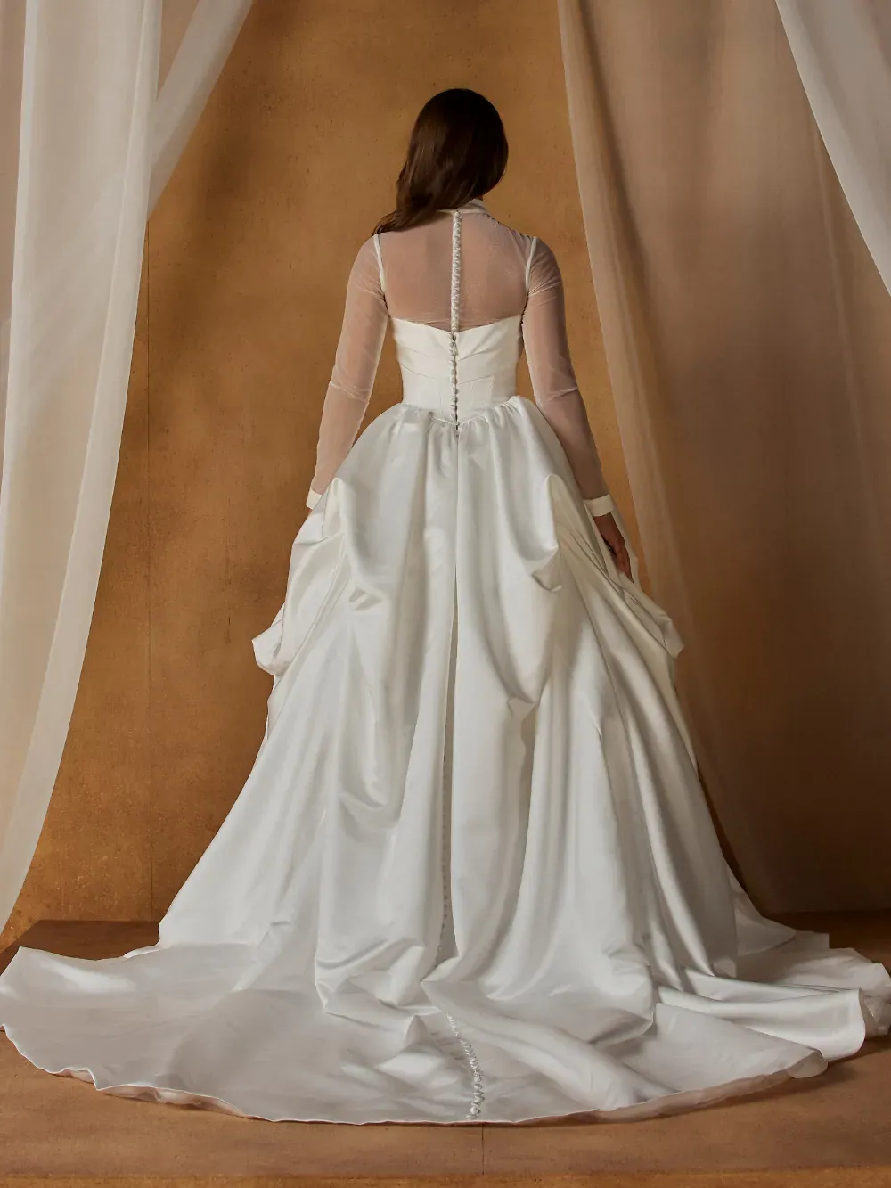 Timeless, luminous, and undeniably regal, Norfolk by Madi Lane Bridal celebrates classic bridal tradition through the richness of delustered satin and bold, sculptural design. With thoughtful tailoring and two distinct styling options, she offers a modern interpretation of elegance for the bride who wants drama with refinement.