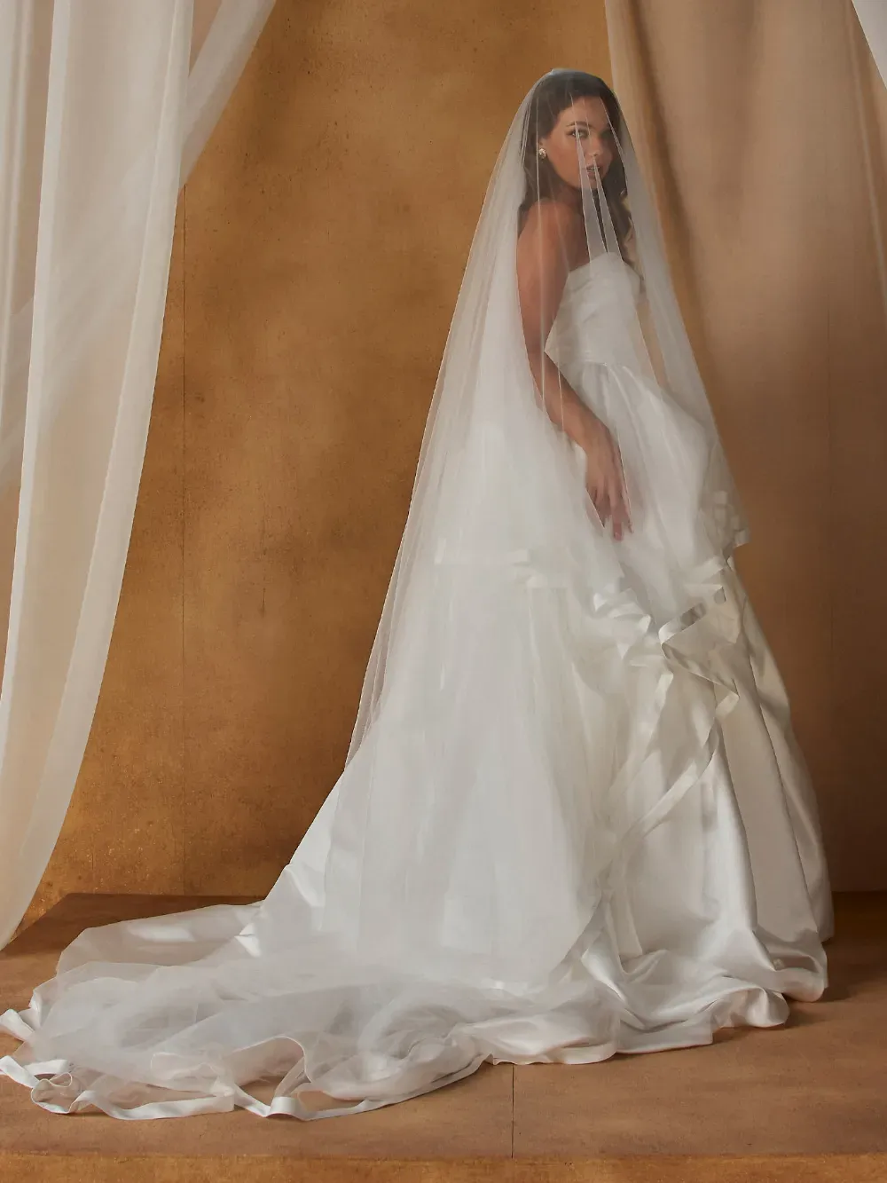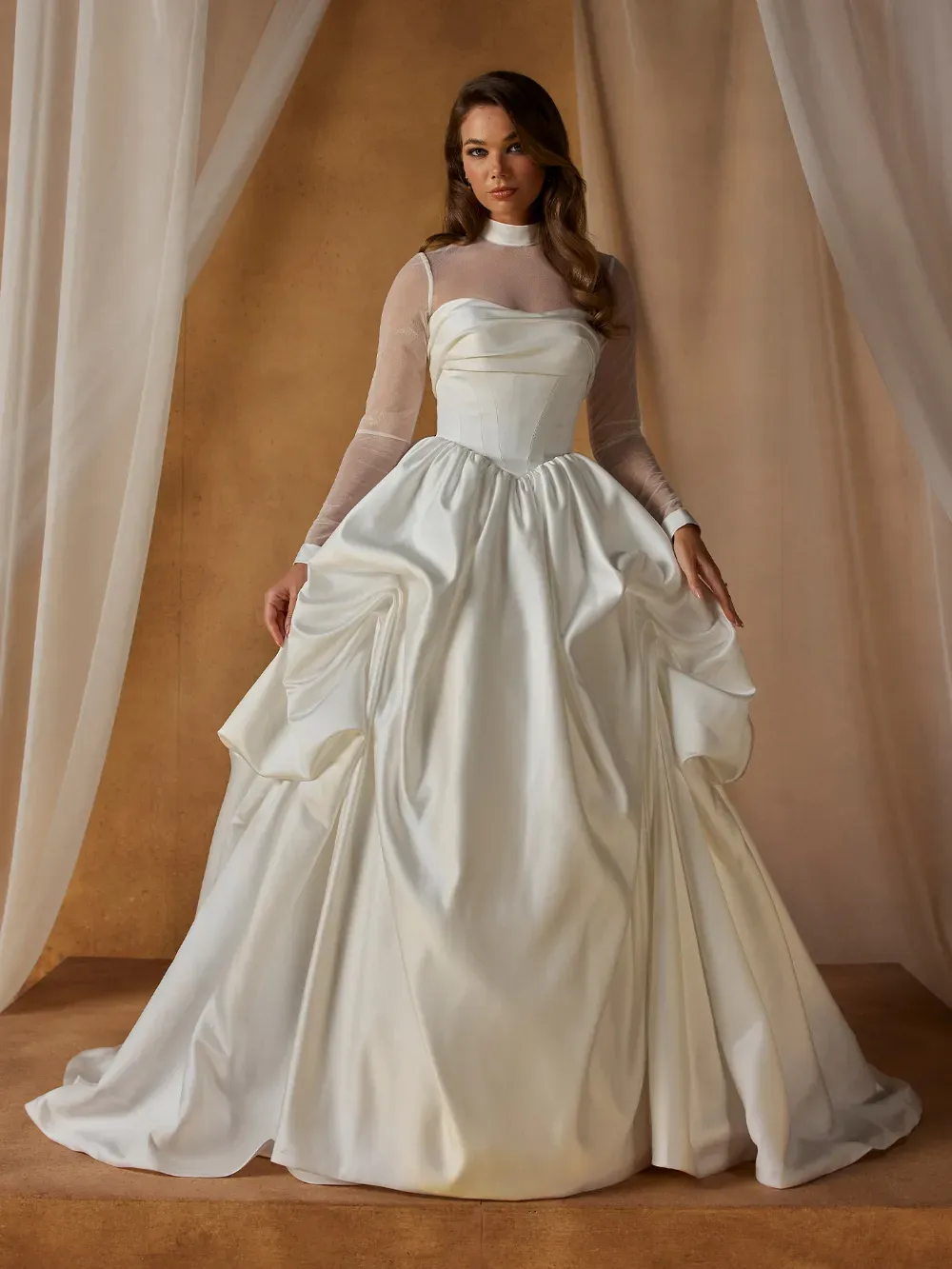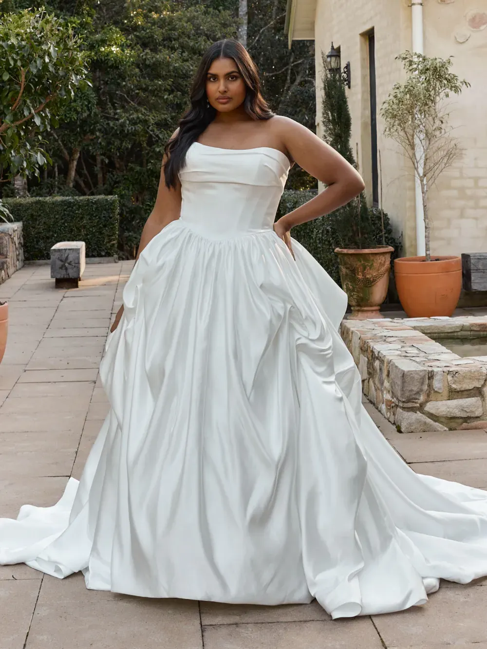 Timeless, luminous, and undeniably regal, Norfolk by Madi Lane Bridal celebrates classic bridal tradition through the richness of delustered satin and bold, sculptural design. With thoughtful tailoring and two distinct styling options, she offers a modern interpretation of elegance for the bride who wants drama with refinement.