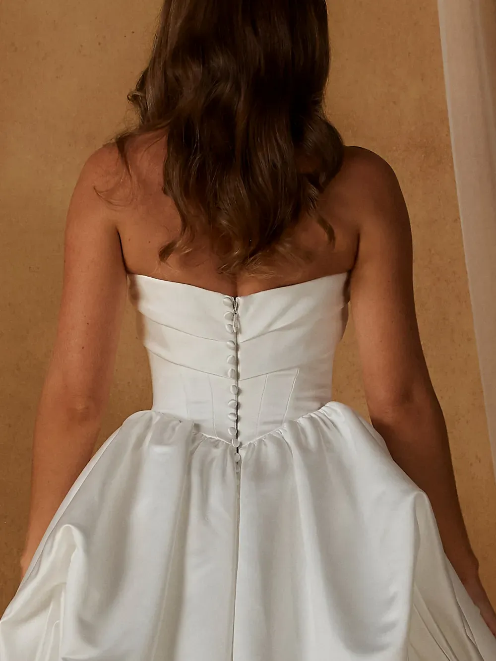 - Strapless satin bodice with draped detail and curved seamlines that sculpt the waist