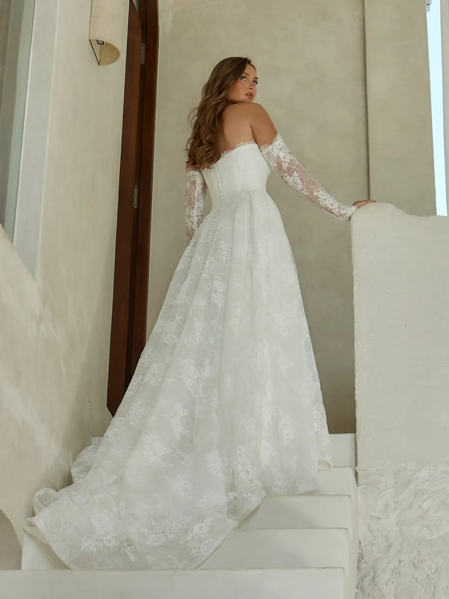 - Strapless straight neckline finished with scalloped lace, paired with detachable long illusion sleeves for versatile styling
